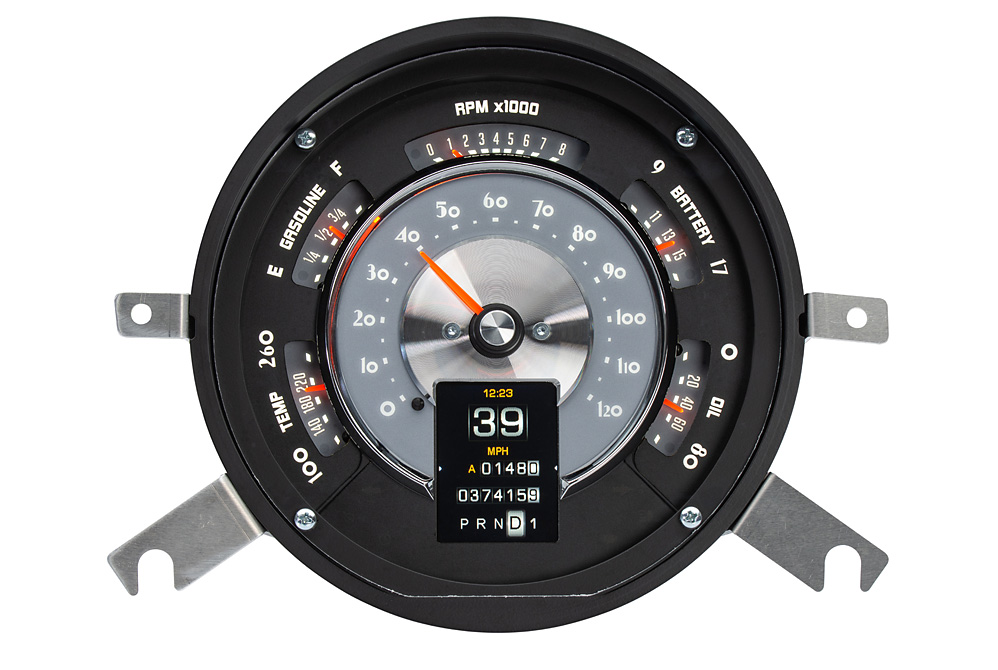 We started by designing our own billet aluminum gauge housing to fit the ’49-50 dash, allowing this to fit directly into place. Next, our engineering team studied the original instrument style and translated that timeless look, while adding LED backlighting, stepper motors needle movements, a full-color TFT message center, and a host of other late model features. Never before have you seen such a stylish and capable instrument system upgrade that bolts into a 1949-50 Chevy car dashboard using stock hardware and retaining the OEM crimp-on front bezel.